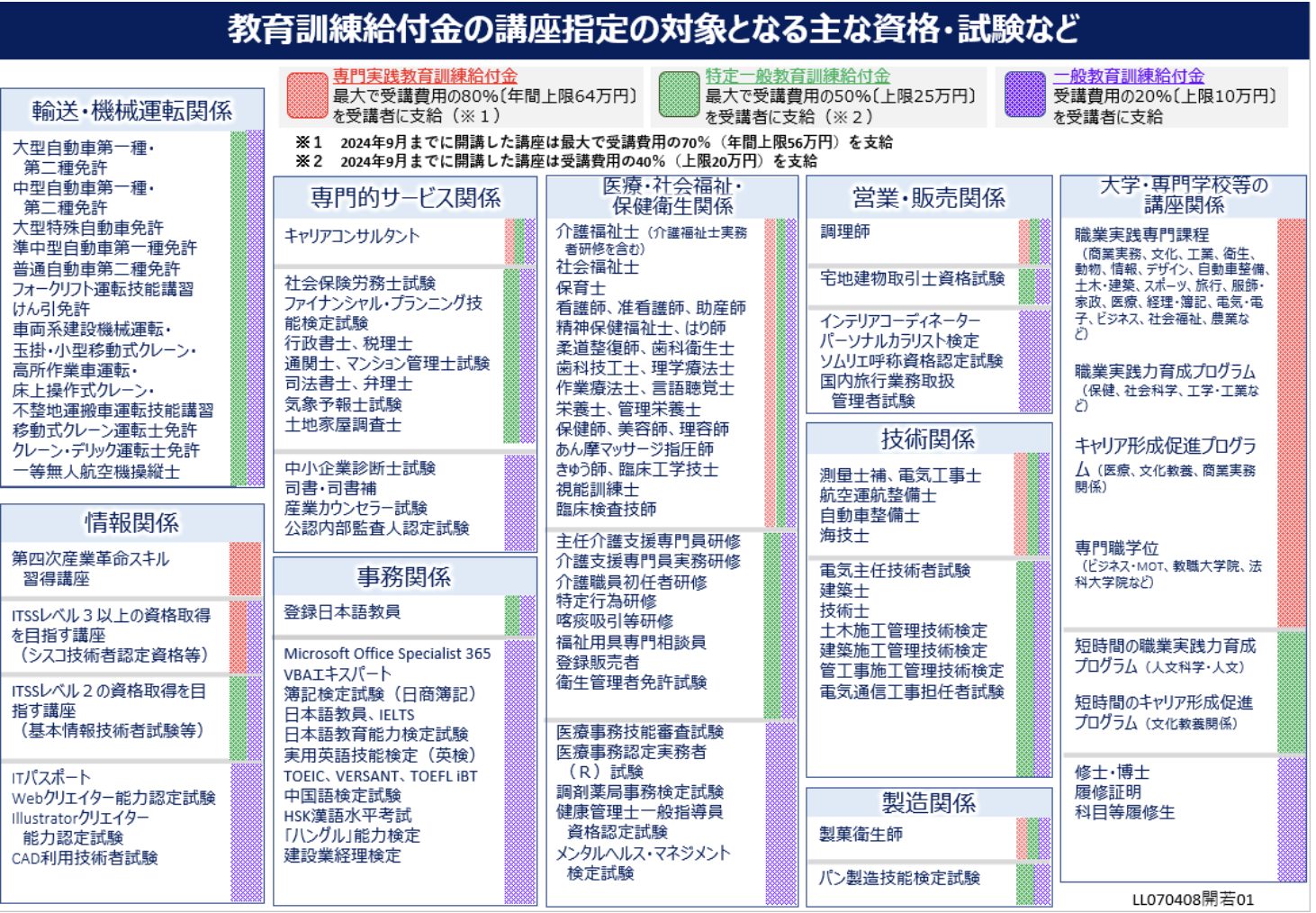 在職中の方については、新設される「教育訓練休暇給付金」が別枠で利用可能です。これは無給の休暇を取って教育訓練に専念する際に、休暇中の所得補填を図る制度で、いわゆる失業手当と同額の「基本手当相当額」が給付されるとされています。