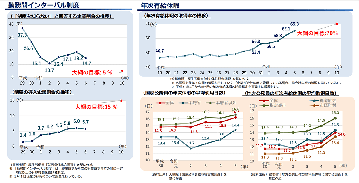 労働時間と休暇に関するデータは、改善の傾向がある一方で、目標達成にはまだ距離がある現状を示しています。