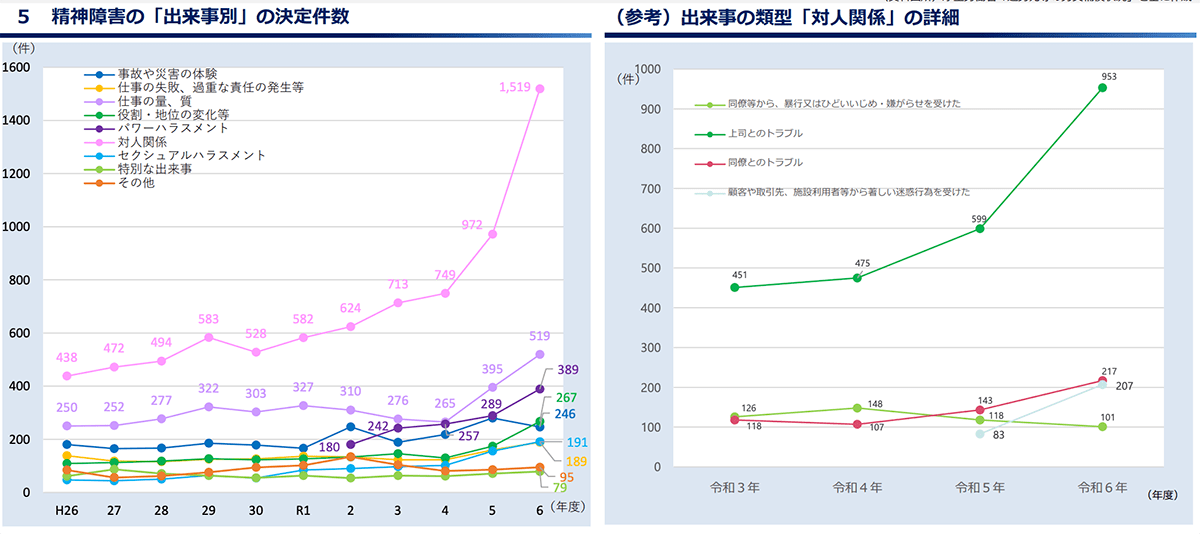 精神障害の労災認定を分析すると、発病の要因となった「出来事」の類型でもっとも件数が多いのは「対人関係」あり、特に令和5年度には972件、令和6年度には1,519件と大幅な増加しています。