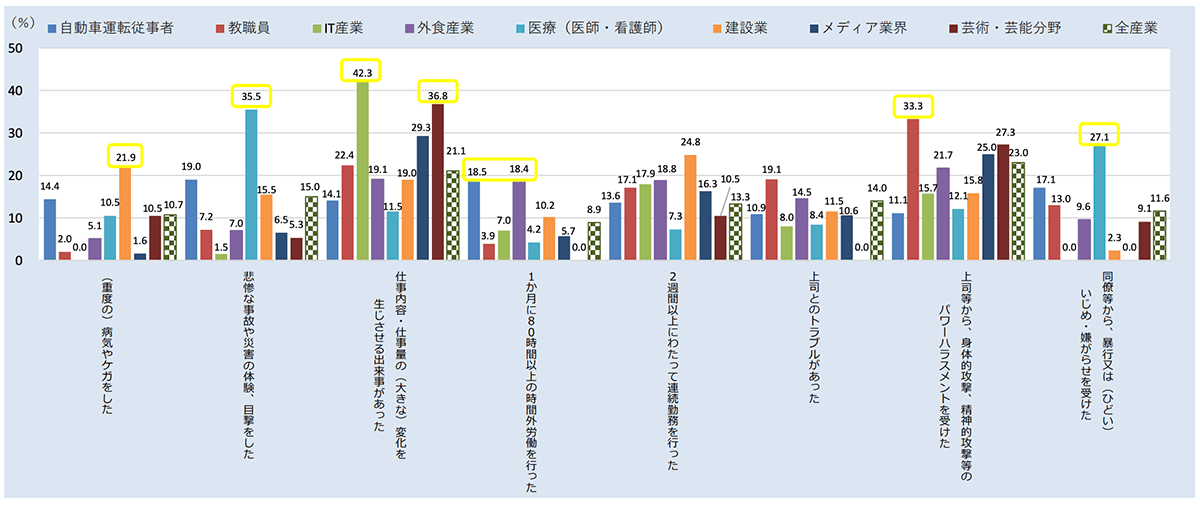「(重度の)病気やケガをした」「2週間以上の連続勤務」の割合が高い - IT産業、芸術・芸能分野