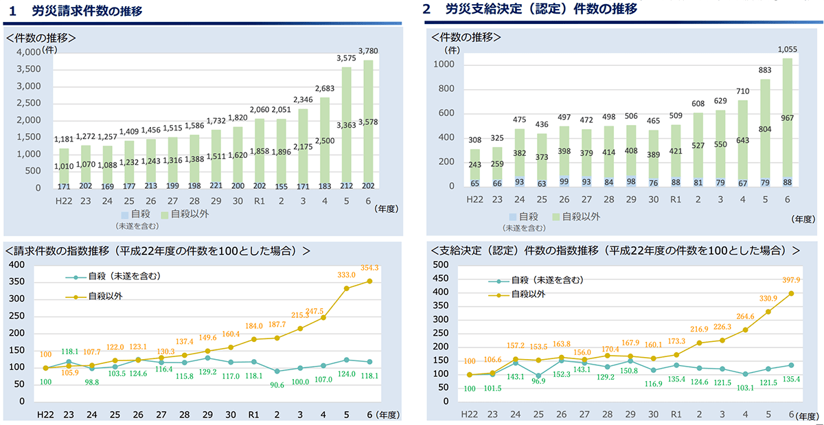 過労死等の労災認定件数は、特にメンタルヘルスに関わる精神障害で深刻な傾向を示しています。